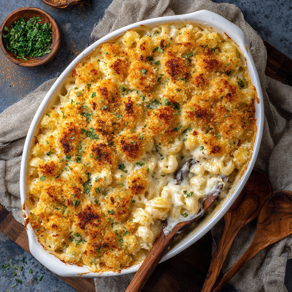 Scoop this beauty with a big spoon—watch those crumbs cascade! For homey vibes, serve straight from the dish at the table (cue oohs and ahhs). Pair with simple greens to cut richness: an arugula salad with lemon vinaigrette or roasted broccoli. Protein pals? Try crispy bacon bits on top, or alongside garlic-butter shrimp. Leftovers? (Ha!) Reheat in the oven with a splash of milk to revive creaminess. And friends? Cold mac straight from the fridge at midnight is a sacred experience.