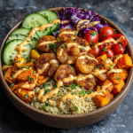 Hey friends, Jackson from Food Meld here! Ever have one of those days where your taste buds are screaming for something exciting, but your body’s whispering, “Hey, maybe throw in a vegetable or two?” Yeah, me too. That’s exactly why I’m obsessed with these Bang Bang Shrimp Buddha Bowls – they’re the ultimate flavor-packed, feel-good solution. Imagine this: plump, juicy shrimp doing a spicy tango in that creamy, sweet-heat bang bang sauce, piled high over nutty quinoa and a rainbow of crunchy fresh veggies and caramelized roasted goodies. It’s like a party in a bowl where everyone’s invited – texture, color, and serious deliciousness.