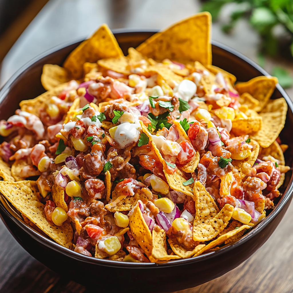 Right before serving, add the Fritos. Fold them in like you’re tucking a baby chip into a cheesy blanket. This keeps them crunchy. Pro tip: Reserve a handful for a garnish—it’s Insta-worthy!