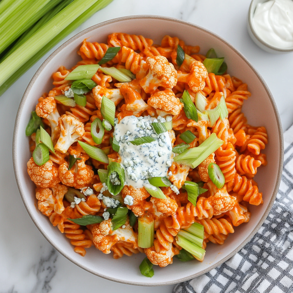 This isn’t just a “vegetarian option” to placate your kale-munching cousin. It’s a flavor bomb that turns heads, whether you’re serving it at a backyard BBQ, packing it for a picnic, or sneaking midnight forkfuls straight from the fridge. (No judgment—I’ve licked the bowl clean myself.) Crispy-roasted cauliflower tossed in tangy buffalo sauce, twirled with al dente rotini, and draped in a cool blue cheese crema that’s basically a spa day for your tongue. Trust me: Wings? They’ll be jealous.