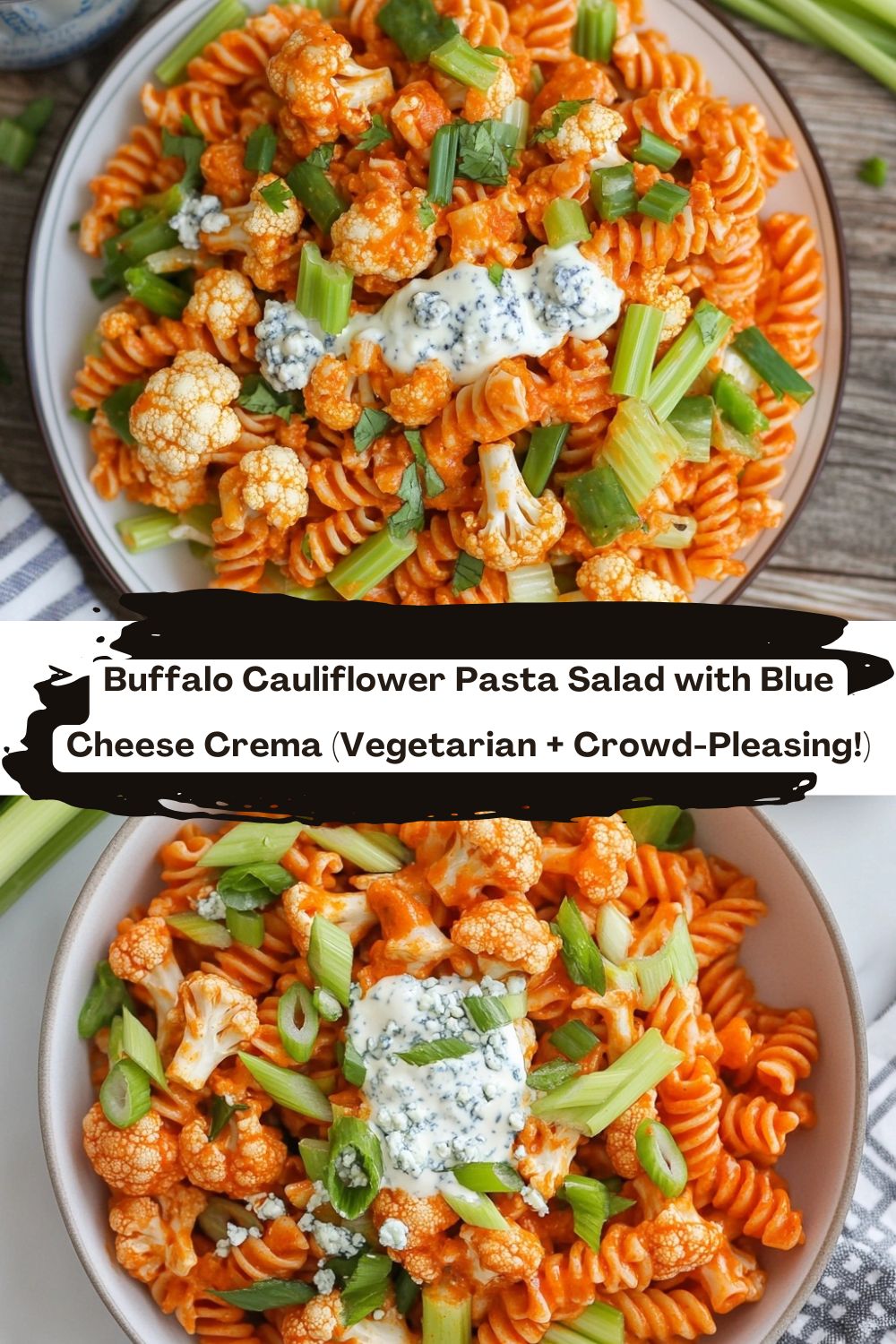 In a big bowl, combine pasta, buffalo cauliflower (with any leftover sauce!), celery, scallions, and crema. Fold gently—don’t smash the cauli! Chill 30 mins. (Resist snacking—it’s worth the wait.)
