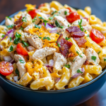 Chicken Bacon Ranch Pasta Salad isn’t just a salad—it’s an edible celebration of everything craveable, creamy, and comforting. It’s what happens when backyard BBQ dreams and meal prep practicality collide in one glorious bowl. With smoky bacon, juicy chicken, tangy ranch, and that addictive pasta chew, every bite delivers bold flavor and total satisfaction.