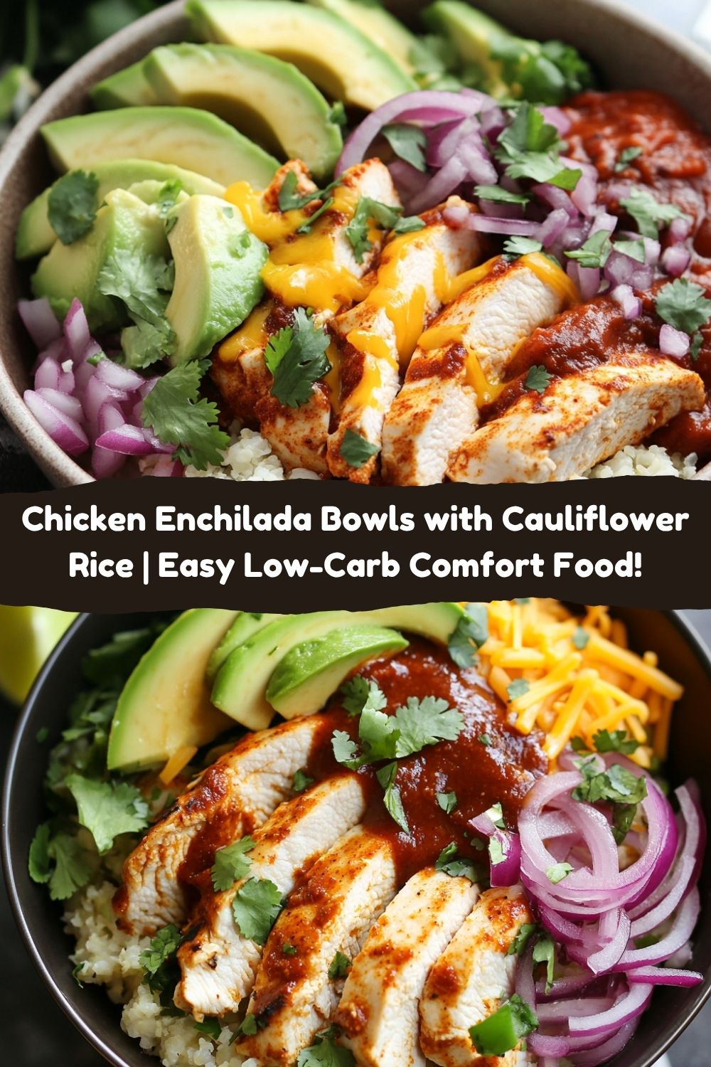 4. Bowl Assembly Extravaganza: Time to build! Divide cauliflower rice among 4 bowls. Top with saucy chicken slices. Drizzle generously with remaining 1 cup enchilada sauce. Sprinkle cheese immediately – the heat will melt it dreamily. Pile on red onion, avocado slices, and fresh cilantro. Presentation Pro-Tip: Layer toppings in sections – it looks Instagram-worthy and lets flavors shine individually!