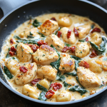 This dish is a one-pan hug—creamy, savory, and rich with textures and flavors. I first made this on a chilly evening when I wanted something fast but soul-satisfying, and it instantly became a favorite. Tender chicken, pillowy gnocchi, and a velvety sauce with sun-dried tomatoes and spinach—it’s weeknight magic in under 30 minutes.