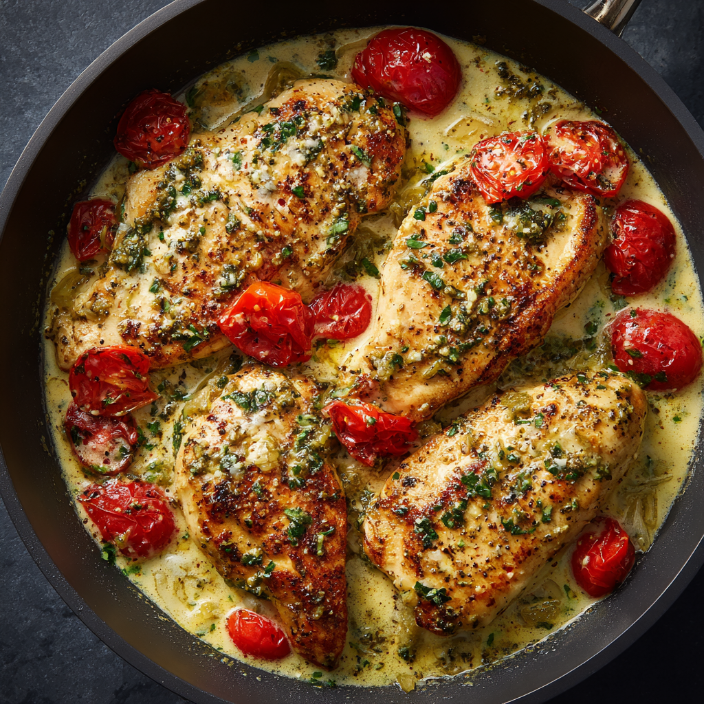 Juicy, golden-seared chicken smothered in a rich pesto cream sauce with bursts of sweet tomatoes and savory aromatics—this dish is a one-pan wonder that feels gourmet, yet cooks up in under 30 minutes. Serve it with pasta, rice, or crusty bread to soak up every drop.