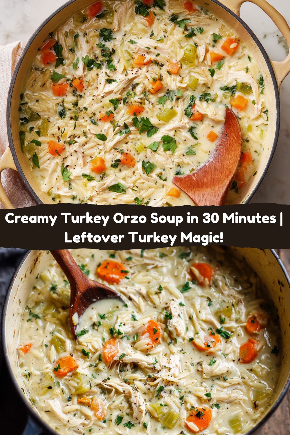 This Creamy Turkey Orzo Soup isn’t just another way to use leftovers—it’s a love letter to comfort, simplicity, and second chances (looking at you, forgotten veggie drawer celery). With just one pot, 30 minutes, and a little soul, you’ve transformed last night’s turkey into a dish that feels like a warm hug on a rainy Tuesday.