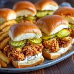 Picture this: juicy, breaded chicken tucked inside soft slider buns, smeared with creamy mayo and layered with punchy pickle slices. On the side? Fries made entirely out of dill pickles—yep, you heard that right. Crunchy, salty, tangy little strips of pickle heaven. Whether you’re hosting a game-day bash, planning a backyard cookout, or just feeding your Friday night snack cravings, this combo has you covered.