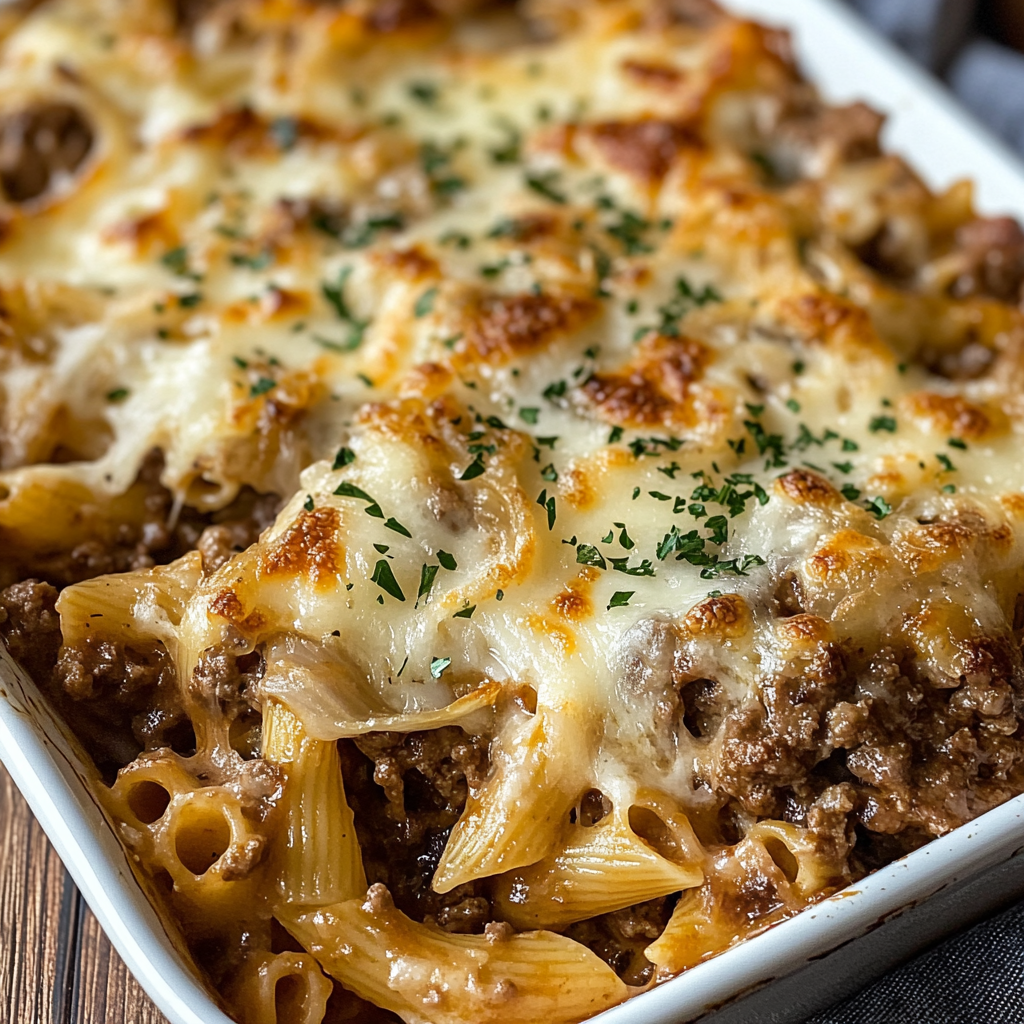 Picture this: eight-year-old me, feet dangling off Grandma Elsie’s wobbly kitchen stool, watching her transform humble onions into molten gold. She’d whisper, “Patience, mon petit—good things take time!” as she stirred that cast-iron skillet for what felt like forever. Her version? A rustic beef-and-onion stew served over crusty bread. Fast-forward 20 years, when a blizzard trapped me in my tiny Brooklyn apartment with only ground beef, pasta, and a bag of onions. Channeling Elsie’s spirit, I started caramelizing… and bam! This bake was born. That first forkful? Instant time travel—straight back to her warm, thyme-scented kitchen. Now, every time I make it, I toast to her with a sprinkle of extra Parmesan. ❤️