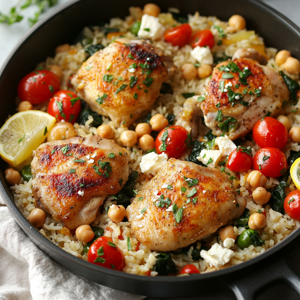 This dish takes me straight back to my cousin Leo’s tiny apartment kitchen in Athens. I was 22, backpacking, and utterly broke. Leo, sensing my “ramen fatigue,” declared, “Jackson, we make real food. Fast!” He pulled out a single battered skillet, some chicken thighs, a lemon, and a block of feta that smelled like salty heaven. “One pot,” he grinned, “less washing, more eating!” As he tossed in tomatoes that popped like fireworks and mountains of spinach that vanished magically, I was skeptical. But then… that first bite. The bright lemon! The creamy feta melting into the rice! The way the paprika gave the chicken this warm hug! It wasn’t just dinner; it was a revelation. Simple ingredients, one pan, maximum joy. That chaotic, delicious moment in Leo’s kitchen, laughing as olive oil sizzled on the stove, is baked into every bite of this recipe. It taught me that unforgettable meals aren’t about complexity – they’re about heart, smart shortcuts, and a whole lot of flavor packed into one glorious pan.