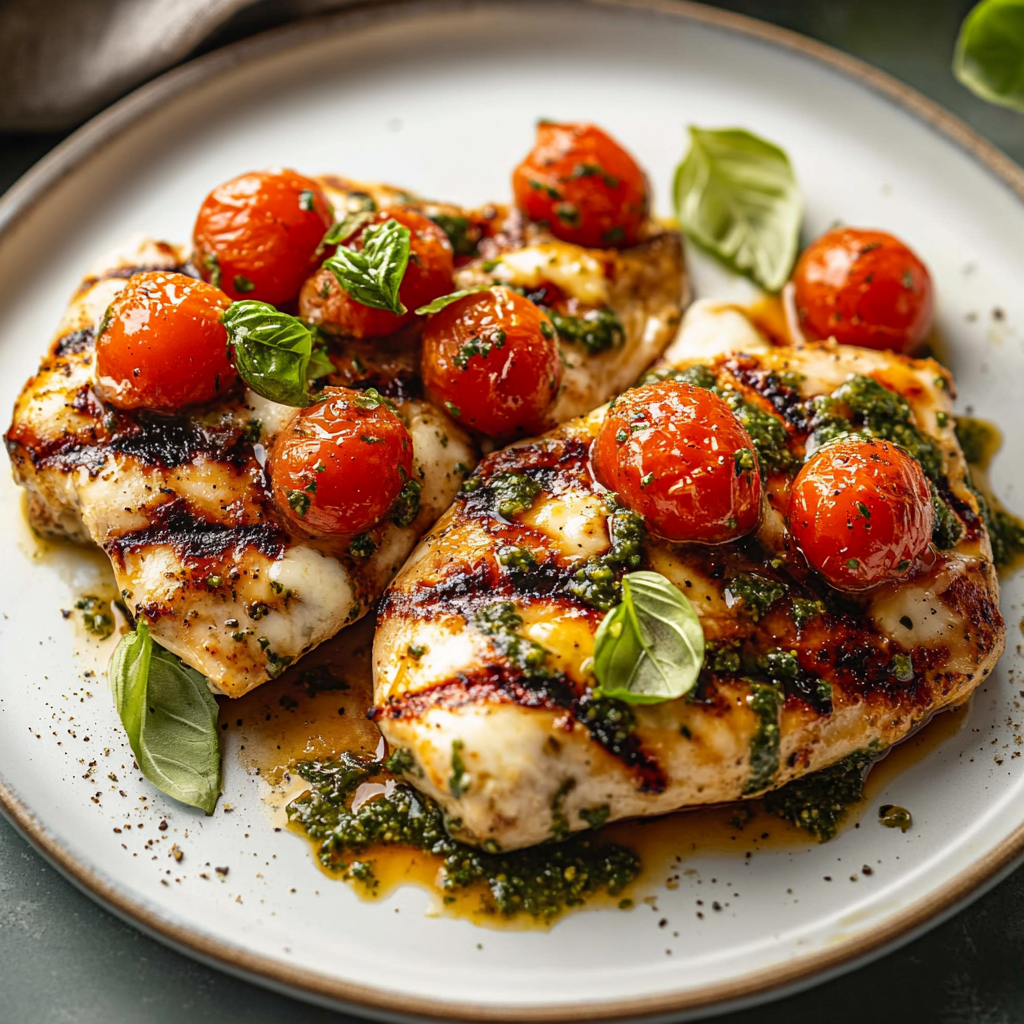 Arrange chicken on a rustic wooden board or white platter for contrast. Stack tomatoes slightly askew, tuck basil underneath like green confetti, and zig-zag that balsamic glaze like Jackson Pollock in a chef’s hat. Serve with grilled ciabatta to mop up the juices—because leaving that gold in the plate should be illegal.