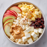 This isn’t just another sad, beige breakfast. Picture this: creamy cottage cheese drizzled with golden honey, sweet-tart apples cozying up to salty scrambled eggs, a swoosh of peanut butter, crunchy cheese cubes, and plump raisins doing a happy dance under a sprinkle of cinnamon. It’s sweet, savory, creamy, crunchy, and packed with 30+ grams of protein to keep you full and focused. Best part? You’re literally 10 minutes away from this masterpiece. No fancy skills, no weird ingredients—just bold, balanced flavor that makes your taste buds high-five each other. Let’s ditch the boring toast routine and cook something that makes you actually excited to roll out of bed!