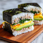 This isn’t just food; it’s your edible passport to joy. Born from Japanese convenience stores but perfected in home kitchens (like yours and mine!), Onigirazu is the ultimate portable, playful, and packed-with-flavor solution. Busy parent? Office warrior? Picnic enthusiast? This beauty travels like a champ, holds its shape, and delivers that unbeatable umami punch. It’s my go-to when I need something satisfying that doesn’t scream “sad desk lunch.” We’re talking layers of seasoned sushi rice hugging a creamy tuna-avocado-egg dream team, all wrapped up in a crispy nori blanket. It’s comfort food with a Tokyo twist, and trust me, once you nail this, you’ll be riffing on fillings like a sushi rockstar. Ready to ditch the boring and cook something awesome? Let’s dive in!