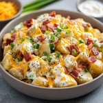 Picture this: It’s a sunny Saturday afternoon, the grill’s fired up, and your squad’s gathered around a picnic table piled high with all the summer classics. But there’s one dish that always disappears first—the potato salad. Not just any potato salad, though. We’re talking about a creamy, cheesy, bacon-studded masterpiece that tastes like a loaded baked potato decided to put on its party shoes. That’s exactly what you’re getting with this recipe, my friends.