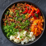 Meal prep is the goal, but let’s talk right now satisfaction! Pile it hot into deep bowls. Top with extra green onions, sesame seeds, and a quick squeeze of lime for brightness. Craving crunch? Add quick-pickled cucumbers (thin slices + rice vinegar + salt, 10 mins) or crushed cashews. For dinner drama, fry an egg and let that yolk run wild through the beef. Pair with an icy-cold sparkling water with lime – the effervescence cuts the richness perfectly!