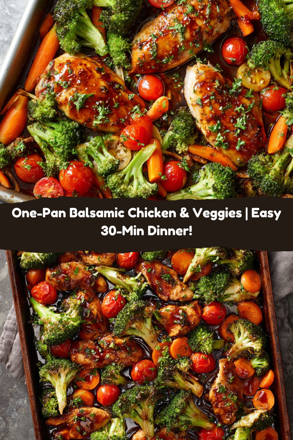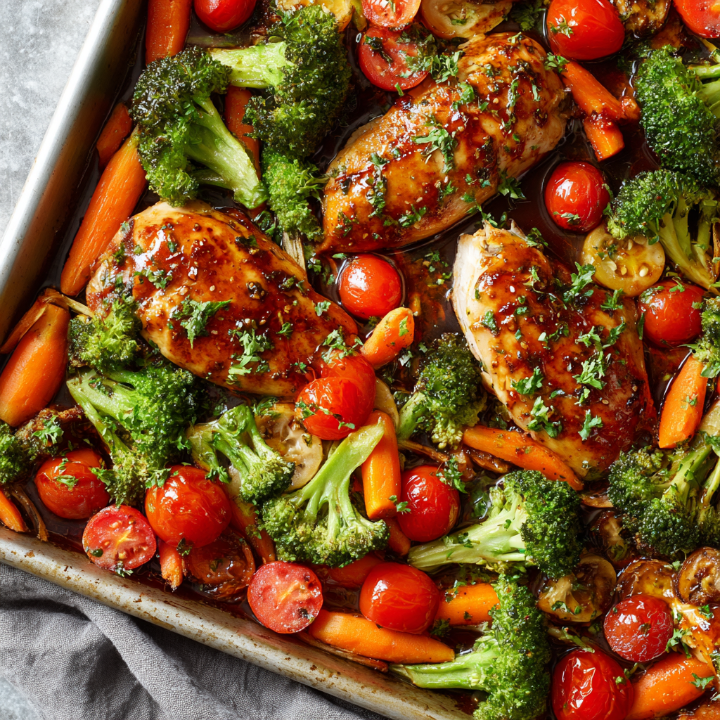 Weeknight dinners just got easier (and tastier!) with this one-pan balsamic chicken and veggie recipe. Juicy, tangy chicken is paired with crisp-tender broccoli, sweet carrots, and juicy tomatoes — all roasted together in a bold balsamic-Italian dressing blend. It’s healthy, hearty, and cleanup is a breeze.