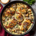 This One Pan Parmesan Tuscan Chicken isn’t just a recipe—it’s a revolution in your weeknight routine. It’s what happens when rich Italian flavor meets practical, health-conscious cooking. You get the indulgent creamy garlic-Parmesan sauce, the sweet pop of sun-dried tomatoes, the meaty mushrooms—all without drowning in heavy cream or drowning your sink in dishes. It’s cozy, it’s elegant, it’s shockingly easy… and honestly, it’s everything a skillet dinner should be.