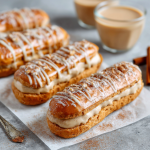 These beautiful éclairs have a light choux pastry made without grains, filled with a creamy pumpkin‑apple cinnamon filling. Finished with a glossy glaze and a dusting of cinnamon, they turn any day into a chic seasonal celebration.