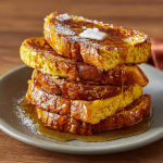 This Pumpkin French Toast brings all the warmth and flavor of fall to your morning table. Thick slices of challah or brioche soak up a pumpkin-spiced custard and cook up golden and crisp on the outside, soft and tender inside. Breakfast just got a delicious seasonal upgrade.