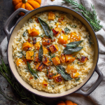 Creamy, cozy, and absolutely luxurious — this roasted butternut squash risotto brings fall flavors to life. Sweet caramelized squash melts into creamy arborio rice, rich with butter, parmesan, and fresh sage. Topped with golden crispy sage leaves, it’s a dish that’s both elegant and soul-warming.