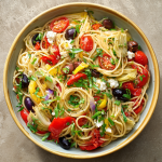 This pasta is the kind of dish that feels like a sunny escape—light, full of color, and bursting with flavor. It’s inspired by seaside meals with simple ingredients and big taste. Whether for a quick dinner or a beautiful potluck plate, it’s always a crowd-pleaser.