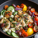 This dish instantly transports you to a breezy evening along the Aegean coast—sunset on the horizon and a table full of fresh, flavorful food. The marinade gives the chicken a tangy, herby punch, while the toppings bring crunch, creaminess, and bursts of juicy flavor. It’s light yet satisfying, perfect for meal prep or a healthy family dinner.
