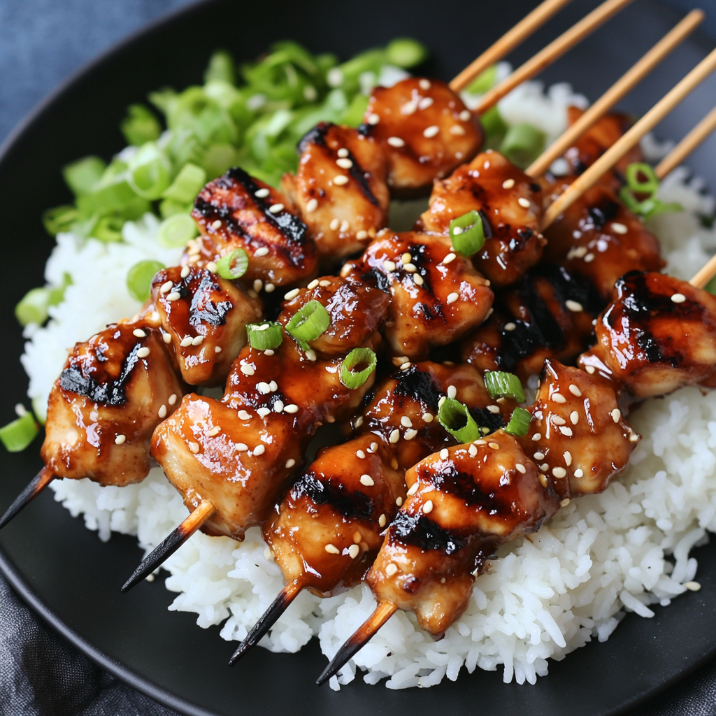 Pile skewers on a platter over fluffy jasmine rice. Drizzle with any leftover sauce (warmed up!), then shower with sesame seeds and green onions. Add quick-pickled veggies on the side for crunch, and watch those skewers disappear faster than my willpower near a cheese board.