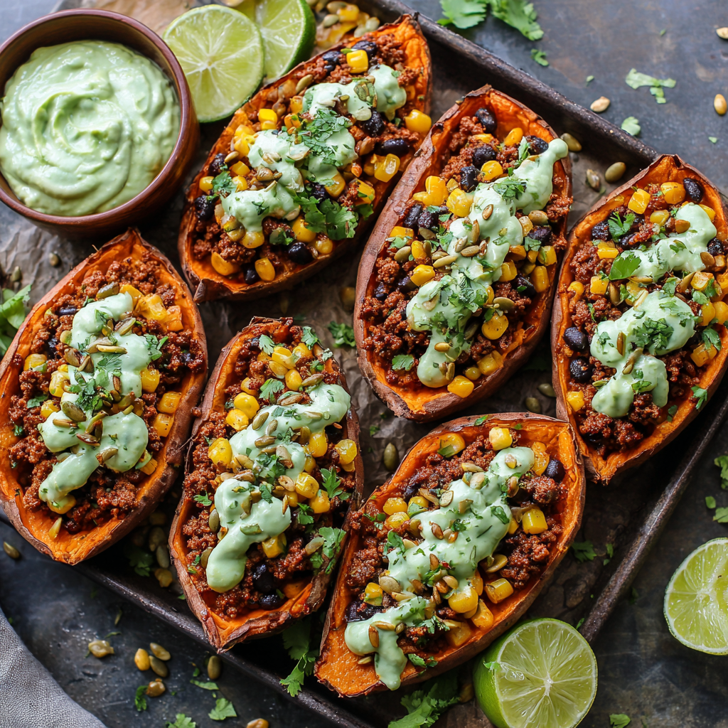 Hey friends, Jackson here from Food Meld! Ever stare into your freezer wishing for something that tastes like you actually cooked it? Meet your new kitchen BFF: Tex-Mex Beef Stuffed Sweet Potato Boats. These aren’t just baked potatoes – they’re flavor-packed vessels loaded with taco-spiced beef, zesty avocado crema, and crunchy pepitas, all wrapped up in freezer-friendly glory. Picture this: sweet potato flesh that’s creamy as butter, hugging savory beef that’s been dancing with spices, topped with bright corn salsa and that cool green crema. It’s like your favorite taco night decided to get cozy with Sunday comfort food.