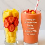 Add the pineapple, strawberries, mango, almond milk, honey (if using), and ice cubes into a high-powered blender.