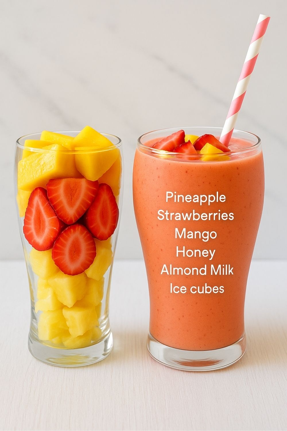 The Tropical Glow Smoothie is a refreshing, fruity, and naturally sweet smoothie made from pineapple, mango, strawberries, a splash of almond milk, and just a touch of honey. It’s blended with a bit of ice to make it cool, thick, and totally sippable. The tropical flavors burst through with every sip, and the texture is smooth as silk.