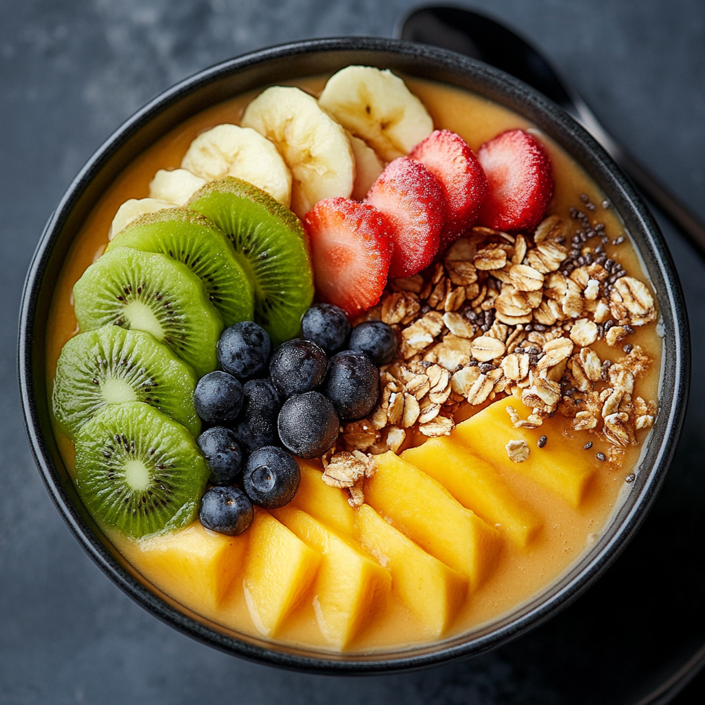 Alright, smoothie bowl artists—time to turn your breakfast into a tropical masterpiece. Your base is the canvas: smooth, golden, and bursting with sunshine vibes. First things first—use the back of a spoon to swirl the surface into soft waves or gentle curves, like clouds over a sunrise. It’s not just pretty; it’s therapeutic.
